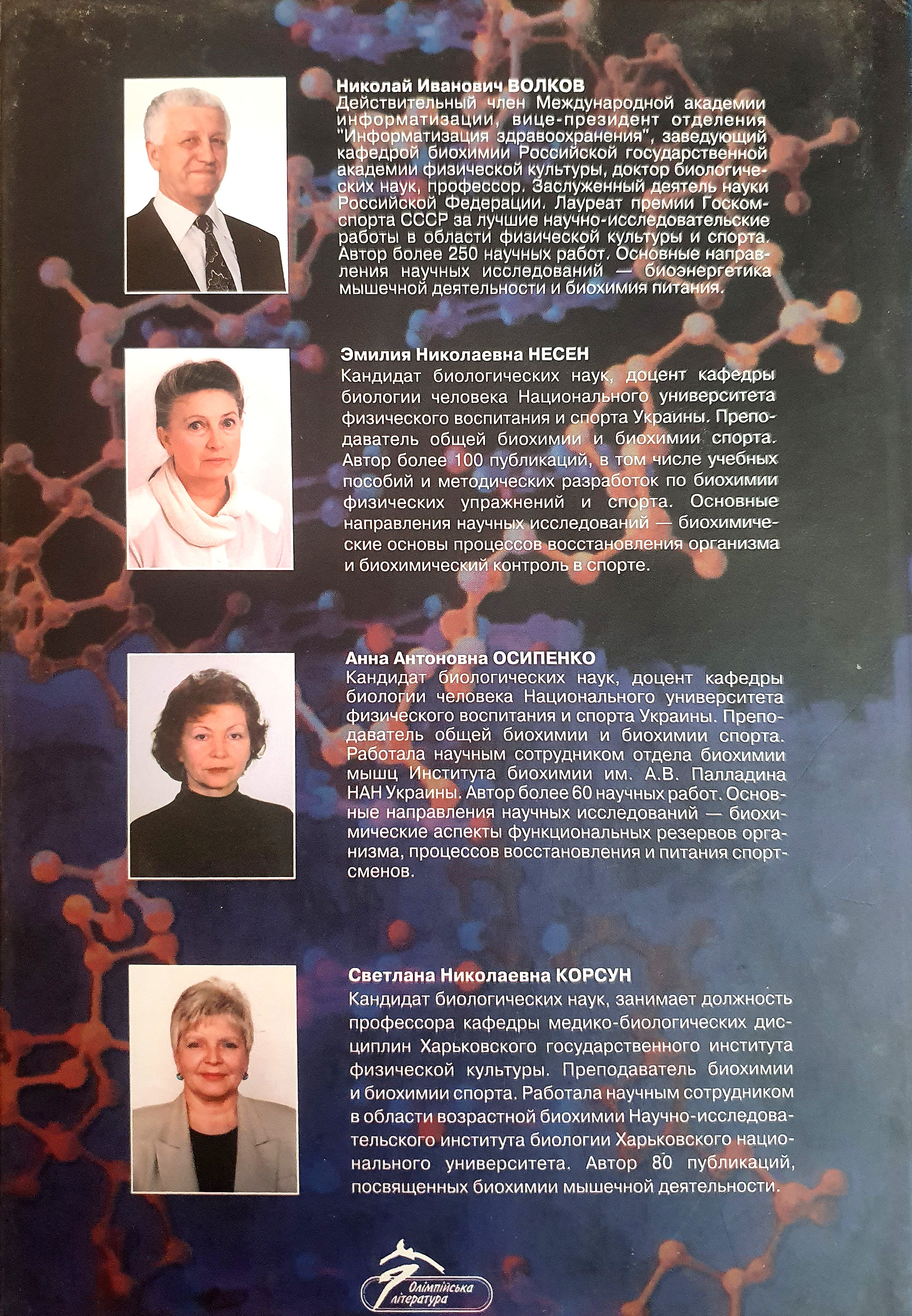 В учебнике изложены основы общей биохимии и биохимии мышечной деятельности организма человека, описаны химическое строение и процессы метаболизма наиболее важных веществ организма, раскрыта их роль в обеспечении мышечной деятельности. Рассмотрены биохимические аспекты процессов мышечного сокращения и механизмов энергообразования в мышцах, закономерности развития двигательных качеств, процессов утомления, восстановления, адаптации, а также рационального питания и диагностики функционального состояния спортсменов. Для студентов и преподавателей высших и средних учебных заведений физического воспитания и спорта, специалистов по физической реабилитации и рекреации.